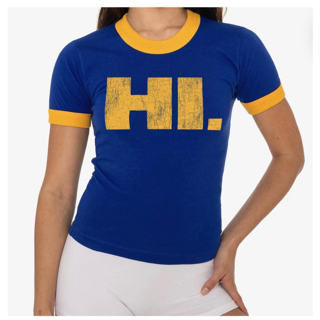 "HI!" Ringer Tee (Blue/Yellow)